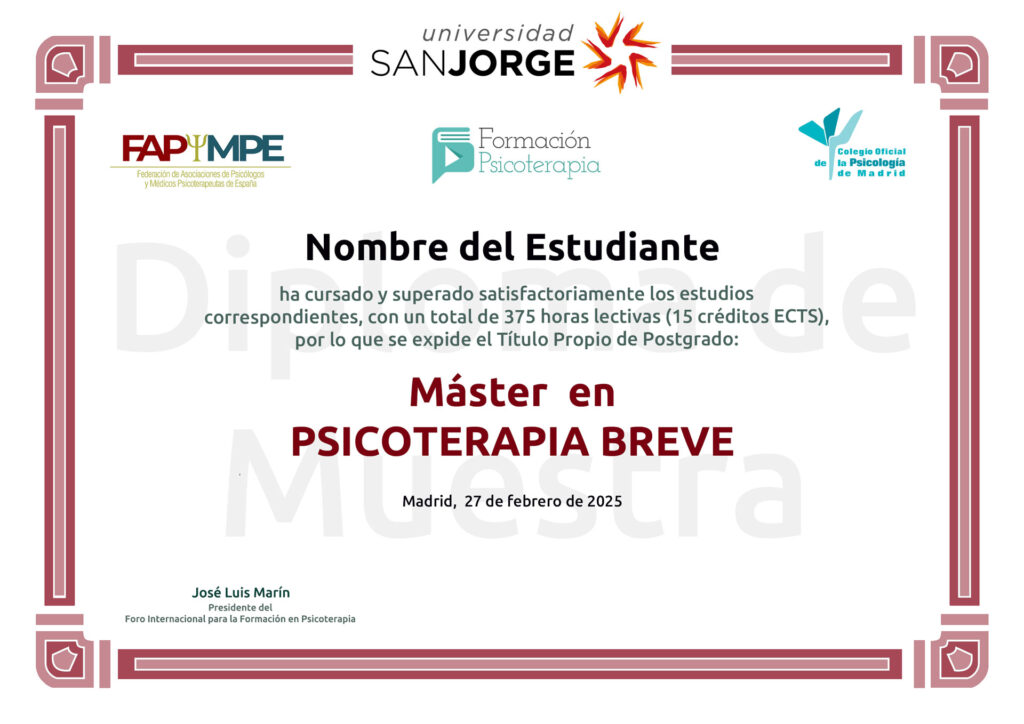 Al finalizar los seis Cursos de Experto obtendrás el Diploma de Máster en Psicoterapia Breve acreditado por nuestras instituciones colaboradoras: La Sociedad Española de Medicina Psicosomática y Psicoterapia, el Colegio Oficial de la Psicología de Madrid, el Colegio Oficial de Médicos de Madrid y la Federación de Asociaciones de Psicólogos y Médicos Psicoterapeutas de España. Además, puedes obtener un título de la Universidad San Jorge (España) abonando las tasas académicas de expedición.